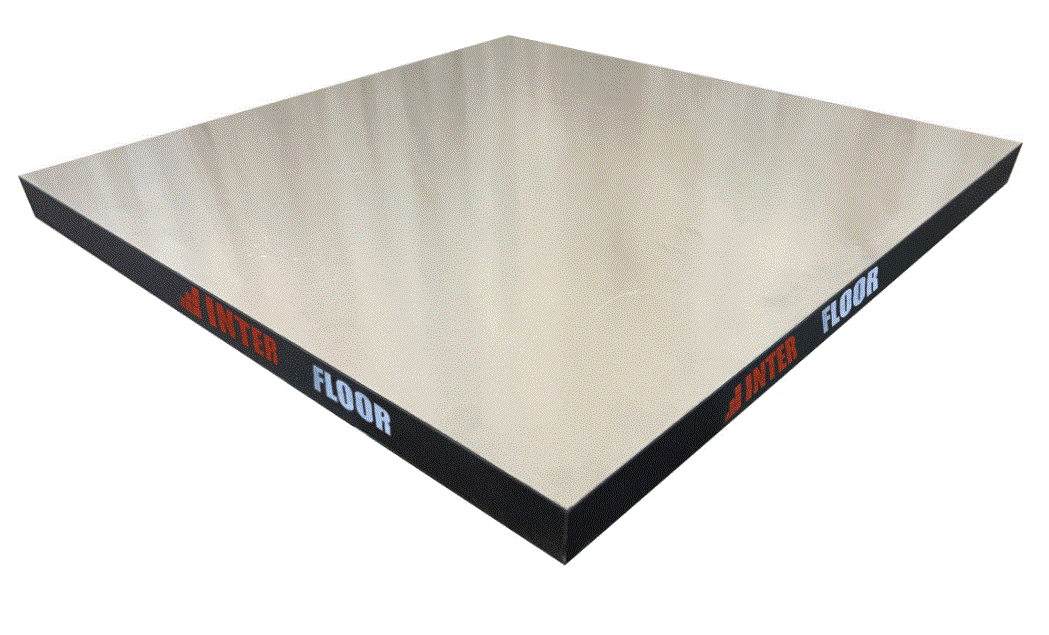 Панель INTERFLOOR H 38 AL/ST. Панель изготовлена из ДСП 38 мм, плотностью от 630 кг/m3. Нижнее покрытие панели: фольга 0,05 мм (AL). Верхнее покрытие панели: стальной лист 0,4 мм (ST). Размер панели: 600*600мм.